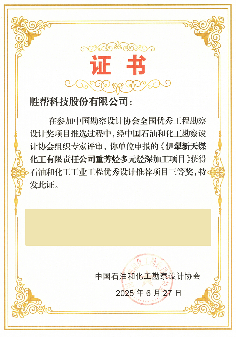 本次評選吸引了行業(yè)內眾多企業(yè)積極參與,共219個項目合規(guī)進入專家評審范圍,經過專家團隊的嚴格評審,最終評選出一、二、三等獎共計131項,其中化工工程領域獎項達90項。在此次評選中,勝幫科技憑借卓越的技術實力與工程創(chuàng)新能力,申報的兩大項目脫穎而出,雙雙榮獲“化工工程優(yōu)秀設計推薦項目三等獎”, 獲獎項目分別為:
