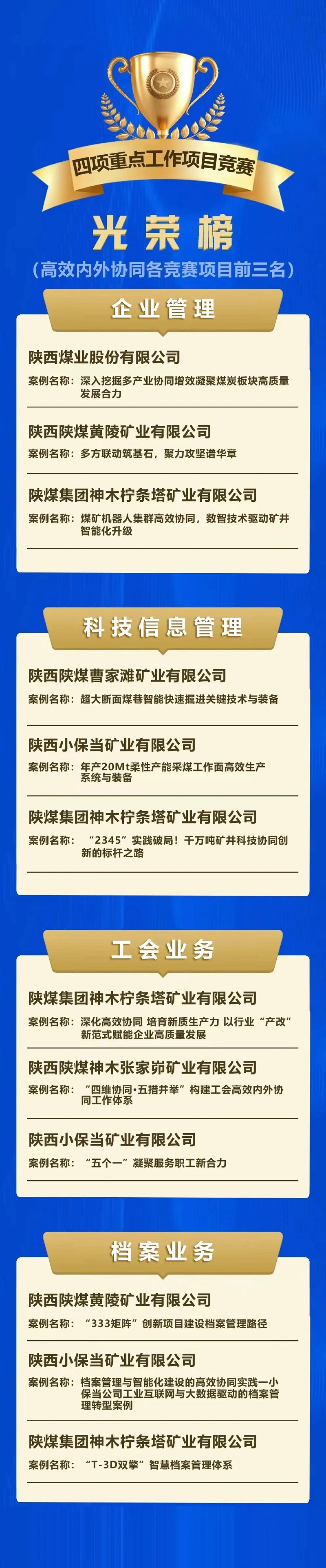 10月23日至24日,陜煤集團(tuán)在曹家灘礦業(yè)公司舉辦高效內(nèi)外協(xié)同業(yè)務(wù)競(jìng)賽。62支參賽隊(duì)伍在企業(yè)管理、科技信息管理、工會(huì)業(yè)務(wù)、檔案業(yè)務(wù)4個(gè)賽項(xiàng)中激烈角逐,最終評(píng)選出金銀銅獎(jiǎng)和金牌案例主創(chuàng)。集團(tuán)公司黨委委員、工會(huì)主席、職工董事李向東及賽項(xiàng)部門負(fù)責(zé)人分別為各賽項(xiàng)獲獎(jiǎng)單位和個(gè)人頒獎(jiǎng)。