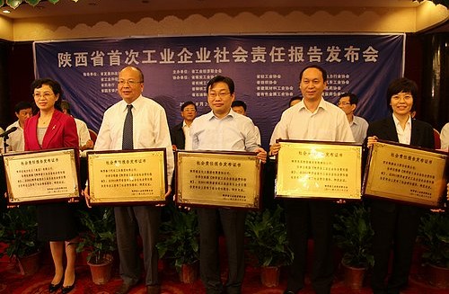 陜煤化集團(tuán)副總經(jīng)理尤西蒂(左三)代表集團(tuán)公司領(lǐng)取社會責(zé)任報(bào)告發(fā)布證書