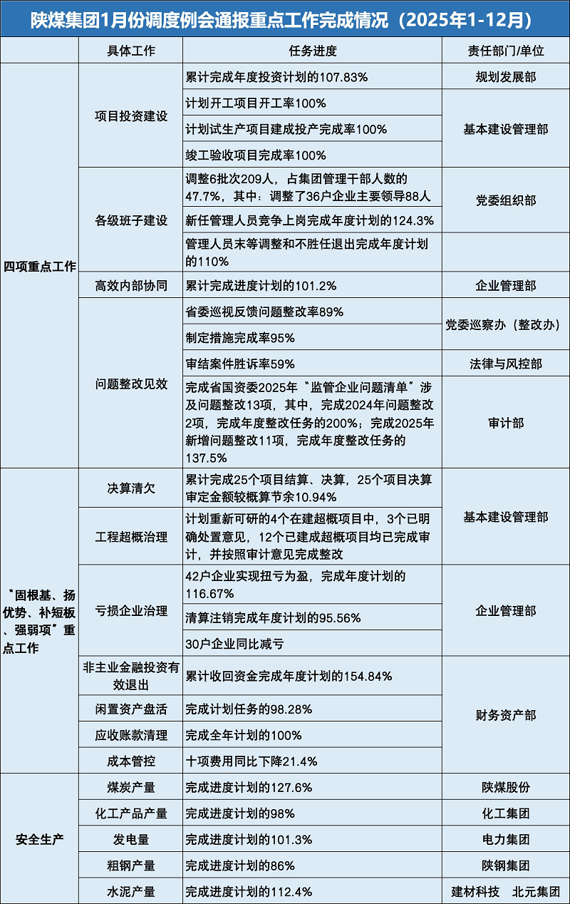 會議總結12月份及2025年重點工作任務完成情況,分析當前工作存在的問題和不足,安排部署近期重點工作;相關職能部門分別匯報了項目投資建設、高效協(xié)同發(fā)展、各級班子建設、問題整改及安全環(huán)保、生產經營、閑置資產盤活、虧損企業(yè)治理等重點工作推進情況。
